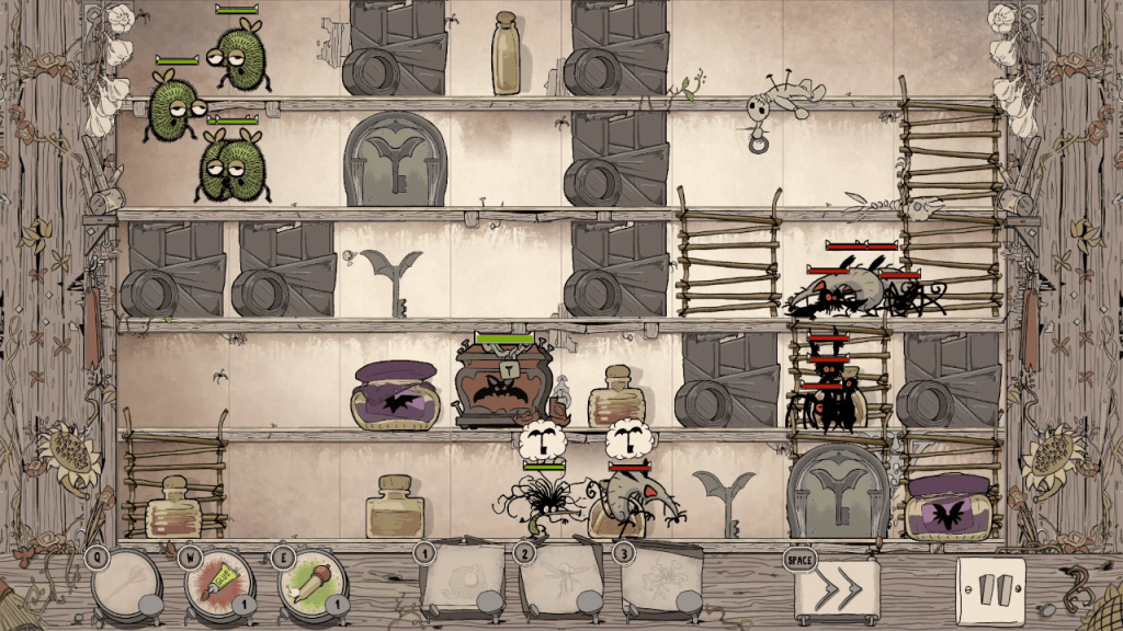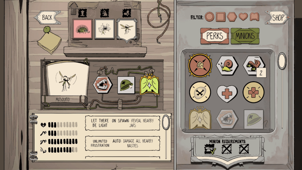 The game is similar to a very stripped down deck building game. You can pick up to three minions per level. Some levels will restrict you to a lower number or require certain types such as flying. After picking your minions, you can equip them with items to increase certain stats. They usually add in a bonus ability, such as revealing the contents of nearby jars, or increase one stat at the expense of another. For example, one item will increase damage but reduce health. The items have shapes such as squares and circles and every minion can only equip certain shapes so not all upgrades can be equipped on every minion to keep it balanced.