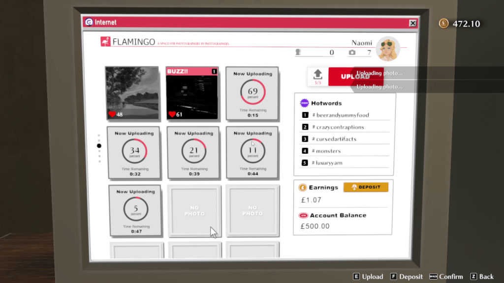 The base game play loop is very simple. You spend the day time taking photographs to earn money. You upload them to a site called Flamingo on what looks like a very old computer running Windows 98. The site has daily hash tags that are popular and if you take photographs of items that match that hash tag, you will earn way more money.
