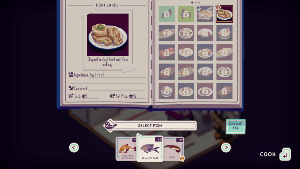 After catching the fish, you can cook up recipes at your home kitchen. Each recipe requires different steps and some recipes will require a specific fish. Once you pick a recipe and start cooking, the cooking minigame will start. You have to press buttons to clean, chop, boil, fry, and bake. One of the mini games in particular are very difficult to do with the keyboard so controller is recommended.