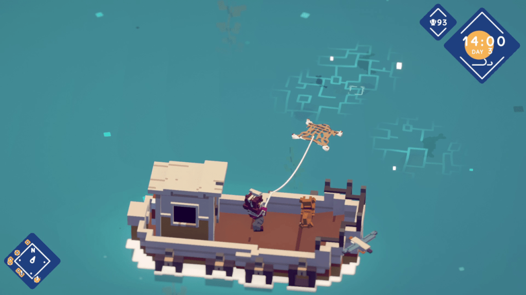 When you start the game, you can only fish from the shore line. You have access to one rod, three different lures, and one bait. The lures attract different types of fish. Depending on the type of fish, you have to use different techniques to reel them in. The faster agile fish require you to pull the rod in the right direction more quickly while the slower, stronger fish require multiple strikes. As of this writing, you can sort of cheese the fishing by casting close to the shore line and striking backwards immediately after the fish bites. I have no problem with this as I want to catch as many fish as possible.