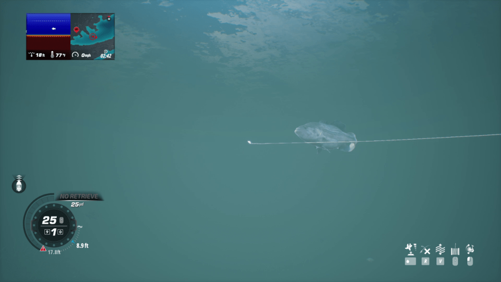 There are two types of casting. One is very straight forward and you simply determine the strength of the throw whereas the other mode lets you have a much finer degree of control. Once you cast your line, you can reel it in in a smooth or stop and go motion depending on the lure and the surrounding fish. Once a fish bites, you strike by pulling back on the rod with the mouse. It was a pretty embarrassing moment, but it took me a while to figure this out since my mouse sensitivity was really low.