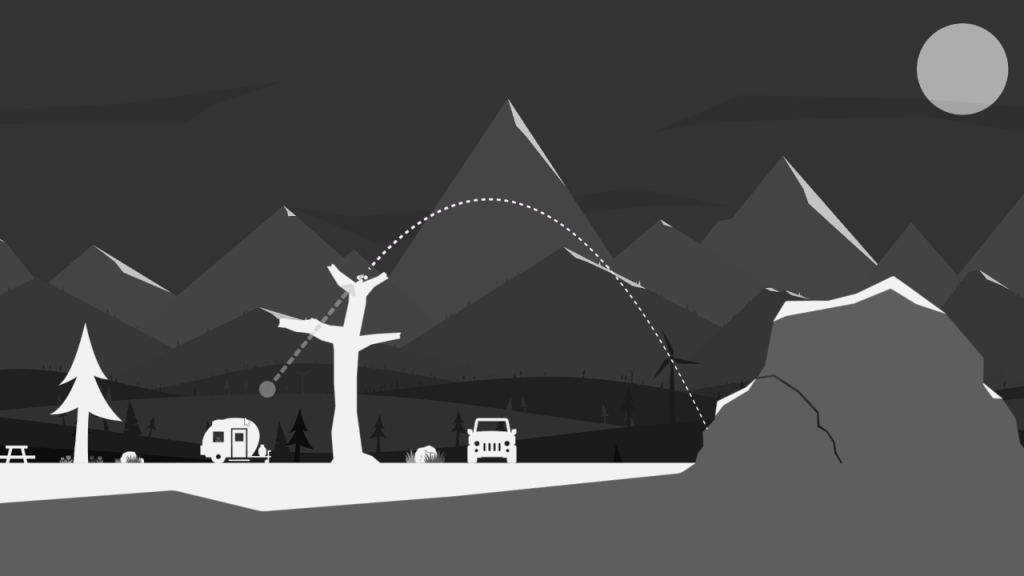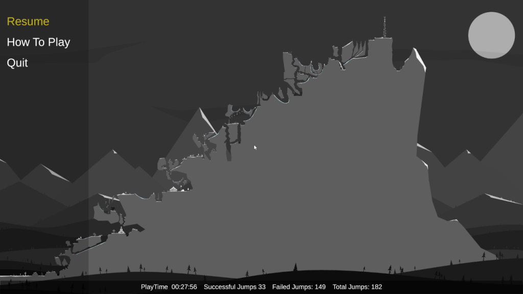 The game’s controls are very simple. You hold your mouse’s left button to set the desired trajectory and release to fling yourself forward. You can press the left mouse button again to tuck in and increase rotational speed. This is key as a lot of the sloped surfaces require you to land on your feet. If you don’t land on your feet, you’ll slide right off…and usually end up losing a lot of progress.