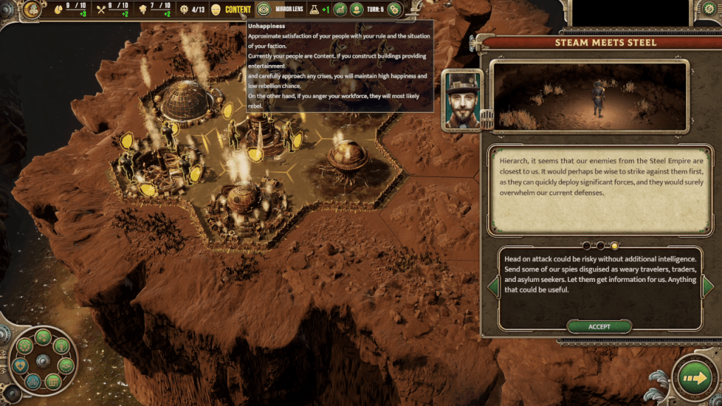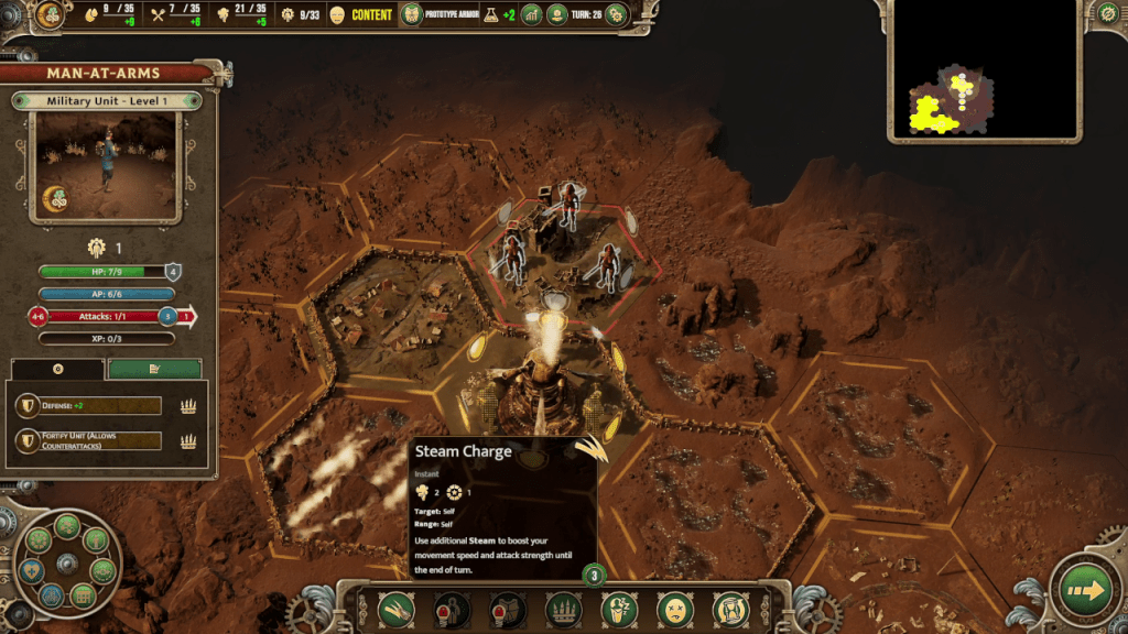 You start out with a small base on a map full of hexagonal tiles. Every turn, you can move any available unit and use any available building. For units, every unit has action points and each action uses a certain amount of points. Some units, such as the sniper, can only attack or move once per turn. They can’t do both since attacking takes up six action points and units have six action points total, whereas the man-at-arms can move a short distance and attack in the same turn. Some units also have special abilities, like the man-at-arms’ Steam Charge ability which boosts movement speed and attack for that turn by using one ability point. You can use Steam Charge, attack a unit with boosted damage, and then fortify and wait to counterattack in one turn if the man-art-arms does not move.