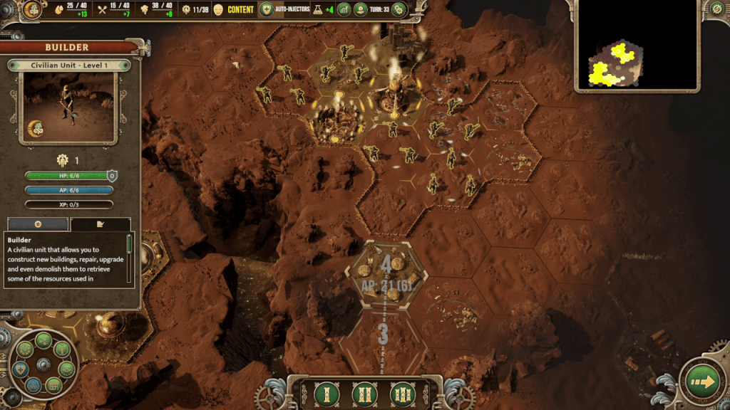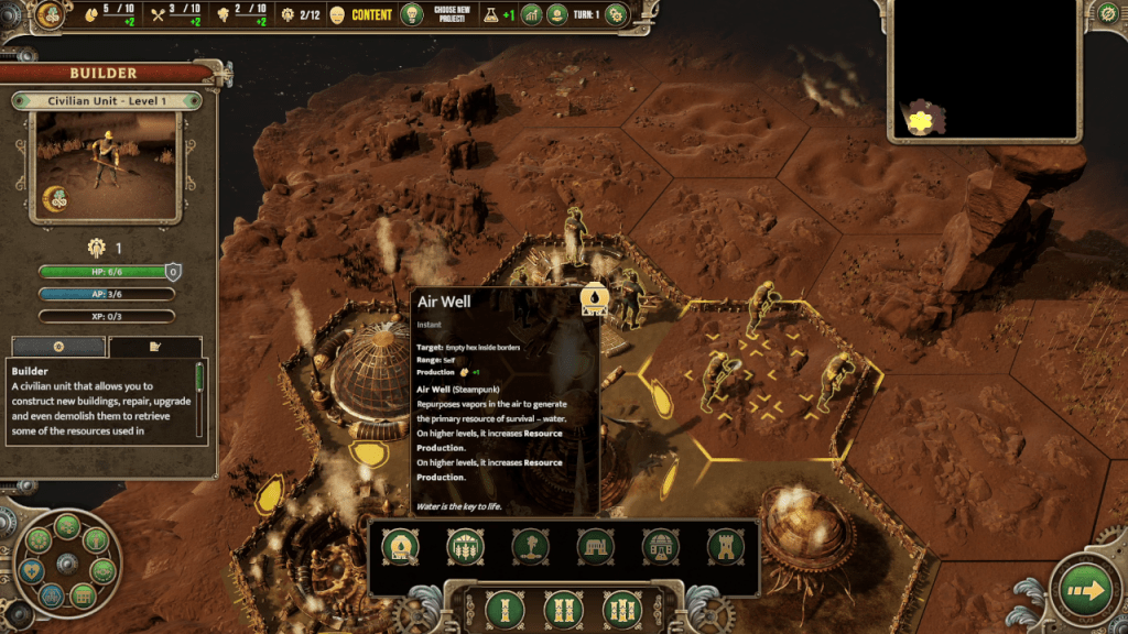The buildings usually fall under two main categories, one produces resources every turn and the other produces units you can fight with. Structures such as the Air Well produces resources such as water, and other structures produce food, steam energy, and science points per turn. You can then spend those resources to create troops or builders. Builders can be used to build new structures or upgrade them as their name suggests. Builders are consumed once used so you have to create more if you would like to create or upgrade more buildings.