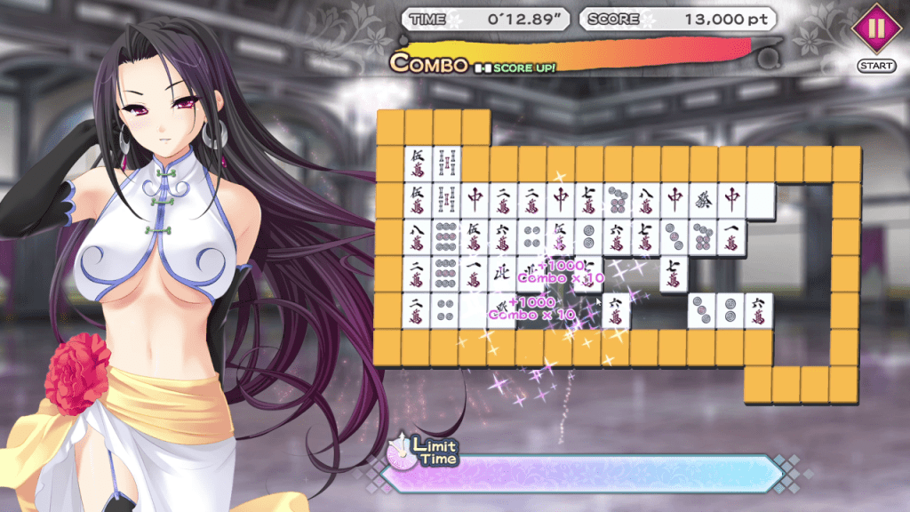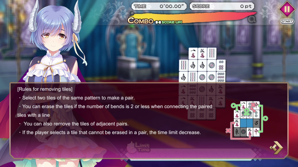 Pretty Girls Rivers (Shisen-Sho) is a simple match two game. There are only a few rules. Matching pieces must be directly next to each other (no diagonals unless the adjacent tiles are empty). If the tiles are apart, and you were to draw a series of straight lines connecting them, the lines cannot bend more than two times.