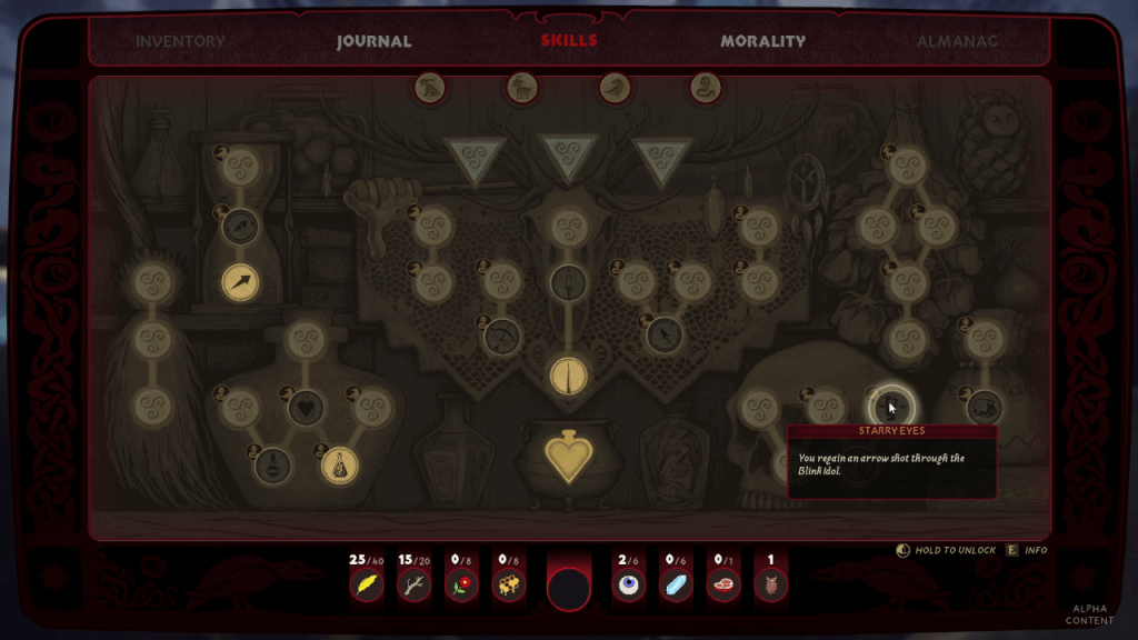 The game felt pretty good to play. You explore the world in first person, talk to these surreal fairy tale characters, take on quests, and then fight your enemies using a bow and magic spells. In between exploring and fighting, you collect crafting materials used to craft your arrows as well as other consumable items. Items are also used to upgrade a simple skill tree that gives benefits such as more damage or being able to carry more crafting materials.