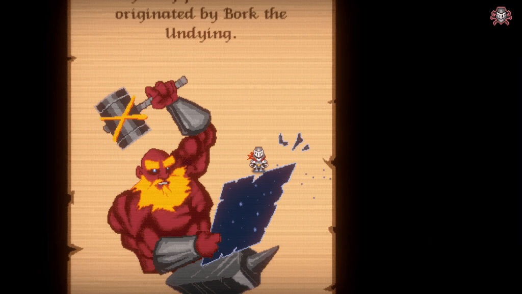 The game starts off with a very lengthy introduction scroll showing the origin story, which can be completely skipped. The developer later references this (even if you didn’t skip it) and goes on a long winded tirade about impatient gamers ruining the industry. After the scroll, you find yourself at the last boss battle, complete with a ripoff of Sephiroth’s theme song in Final Fantasy VII.
