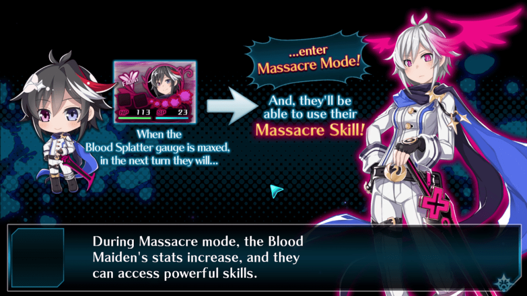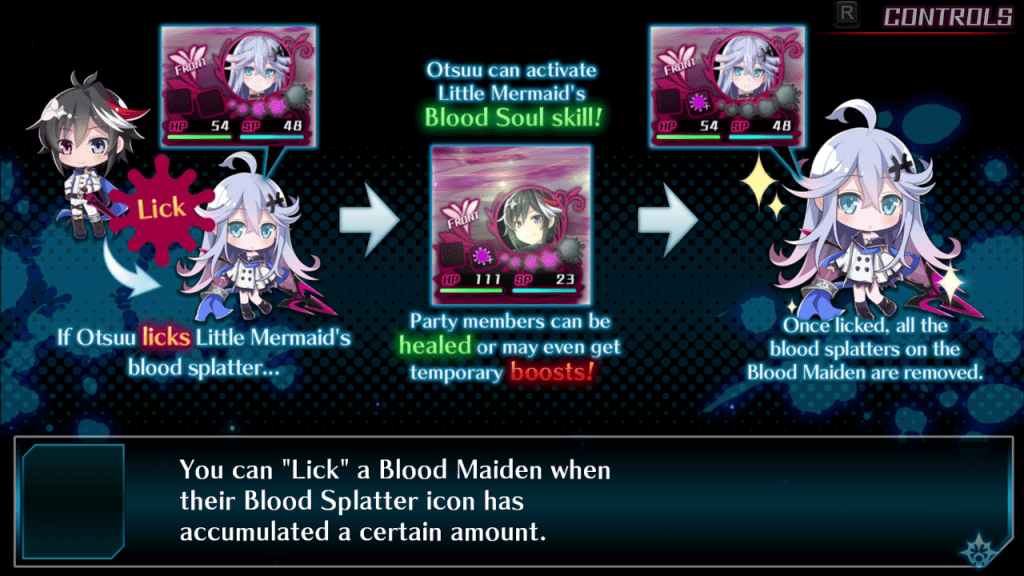 The dungeon crawling is pretty fun and the game does throw in some unique and quirky mechanics. There is an interesting mechanic of powering up a meter with blood splatters obtained by landing a critical hit or an overkill on an enemy unit. You have the option of waiting for the blood splatter meter to fill up to enter massacre mode, where the characters get a massive boost and unlock temporary but powerful abilities. You can also lick the blood off of a character to unlock healing abilities at the cost of removing all the blood splatters. It’s an interesting mechanic where you can choose to focus on offense or defense as needed.