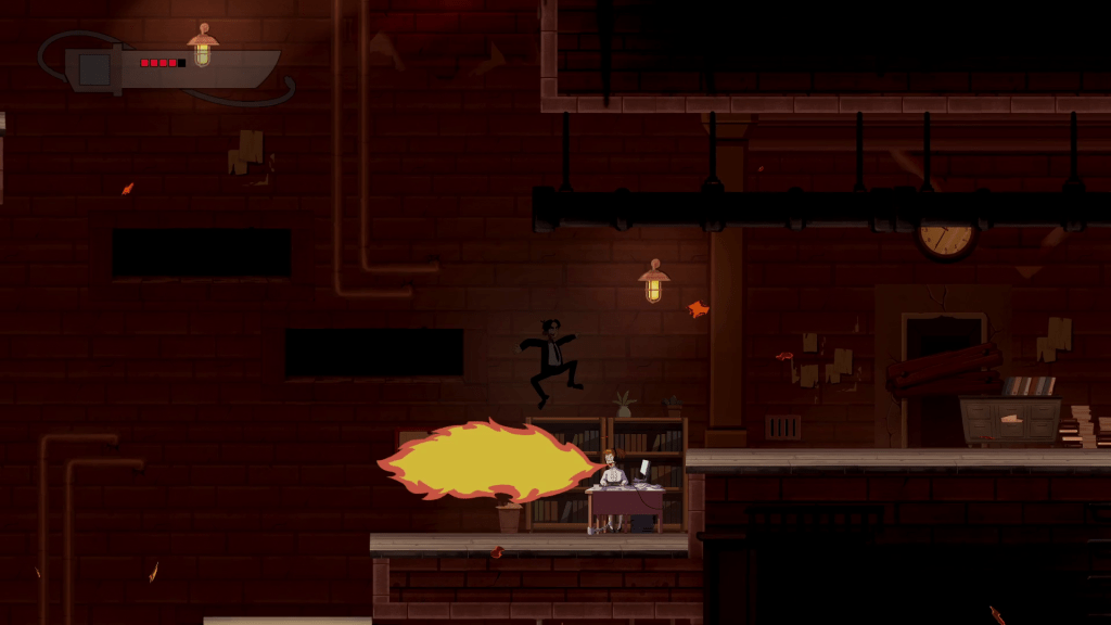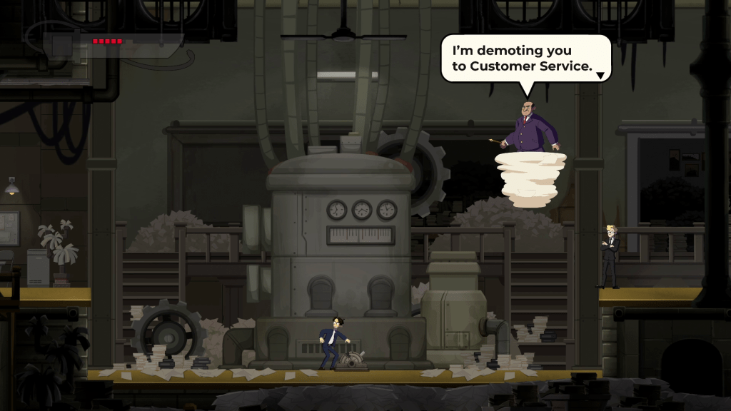 Combined with the attacks are a jump and dash to help you navigate the levels and avoid enemy attacks. There are a lot of very silly and metaphorical enemies such as fire breathing secretaries, ladies hiding behind speakers, chair jockeys fooling around when the boss isn’t looking, and so on. The game does a pretty good job of introducing new enemies at a nice pace and making each one feel pretty unique in how you approach them.