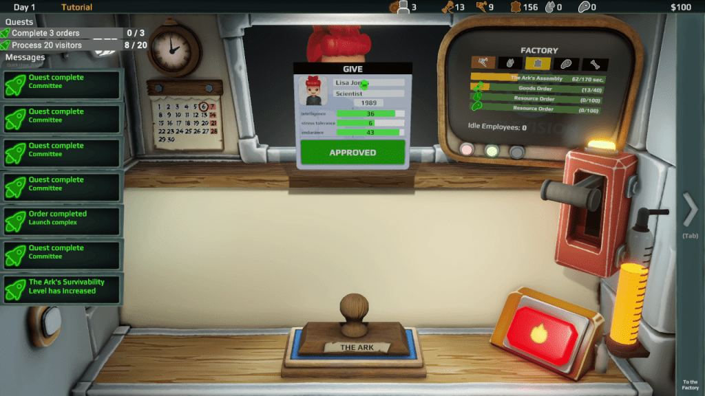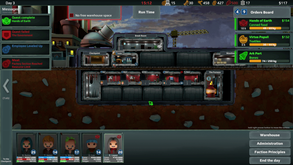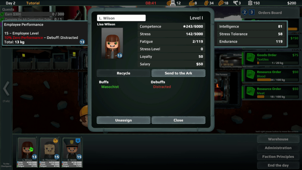 In between admitting people at the window, you can switch to the warehouse tab to manage your employees and meet orders from all the factions. The general order of building the ark from the government must be met but other factions may request supplies as well. You assign employees to harvest a specific organ from the people you send to the warehouse and since you won’t have enough employees to do everything in the beginning, you have to pick and choose which orders to fulfill. Completing orders earns you money which can then be used to upgrade the warehouse.