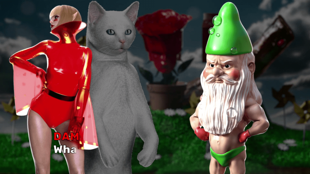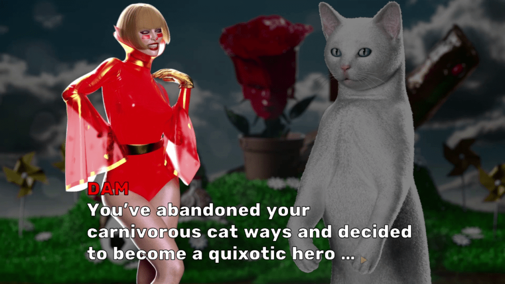As Dam proceeds in her adventure, she meets and befriends a cat on the condition that the cat promises not to eat her, as cats have a tendency to eat diminutive creatures such as elves and gnomes. Apparently gnomes are different from elves in that they give cats a tummy ache. Dam pretends to not hear this and she makes her merry way with her newfound cat companion to defeat the monsters and bring about the Elftopia.