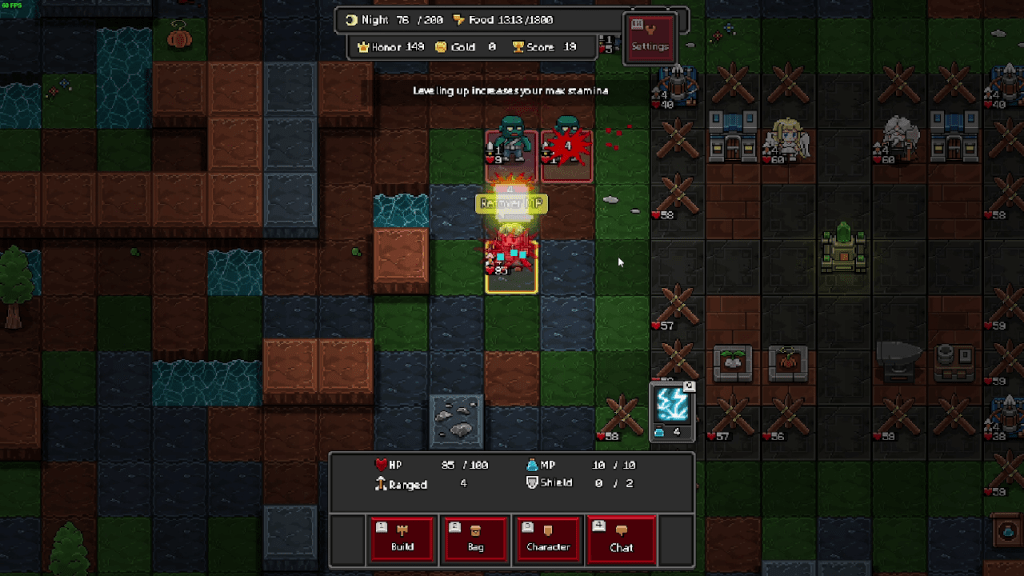 It is pretty satisfying moving around, mindlessly collecting all the resources the land has to offer. Researching, upgrading, and building up your base into a mighty, monster slaying stronghold is also engaging. The only real flaw as of now is the user interface. Simple, repetitive tasks such as building walls takes way too many mouse clicks. For example, you have to select the build menu, select the roadblock the first time through, select build, and place it down in one of the four squares around you. If you want to build the roadblock a second time, you need to move to the correct tile, go select build, select build again, and select a tile. It would be much simpler to simply select build, go select the roadblock, and then press the tiles where you want roadblocks placed.