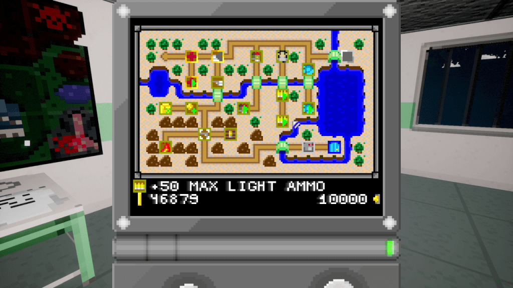 The game can get difficult but thankfully it is very generous with how it deals with death. You simply respawn at the start of the current level. Once you successfully exit the level, you can then spend your hard earned gold on upgrades. To upgrade, you play an old school platformer that feels like an homage to the original Super Mario Bros. The upgrades are pretty handy and provides bonuses such as extra health, increased ammo capacity, increased starting ammo, and etc.