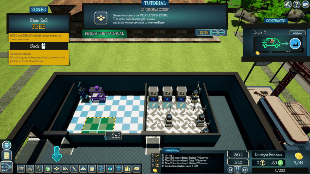 One tip I received from the publisher was to create a small general zone inside your production room so the robots can drop the intermediary products close by the machinery. This in turn means they don’t need to move around as much, saving you a lot of time and money from having to maintain your robots.
