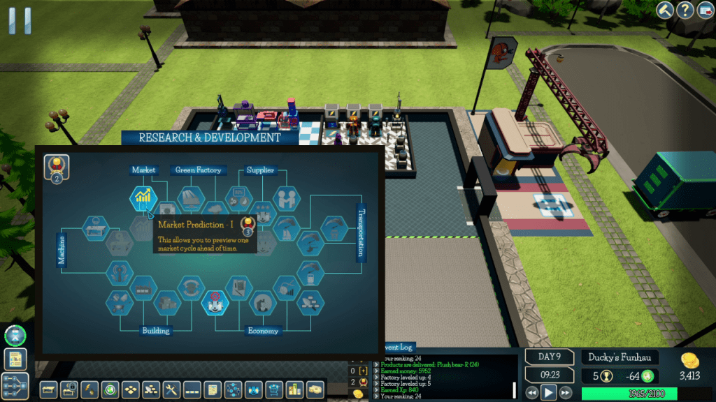 As you sell products, your factory will level up and gain R&D points. These will let you unlock new technologies and produce more complicated products. It is well worth using your R&D points as it will help you increase profitability and make it much easier to maintain your robot army.