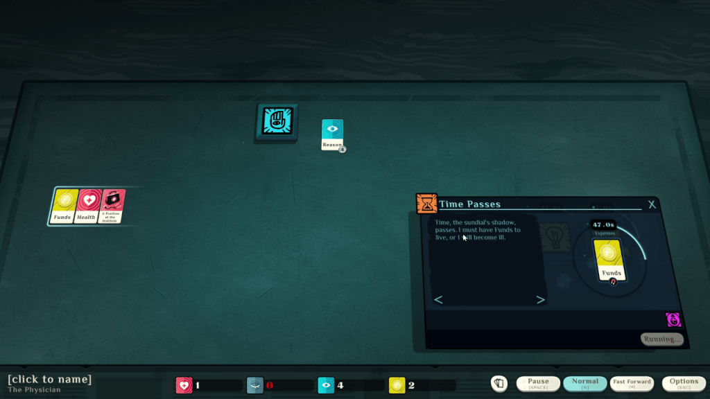 As you play, certain events seems to trigger as well. For example, on most of my play throughs I met a lady who needs a sacrifice. A long timer begins and before it ends you must find a person to sacrifice or you will become the sacrifice and the game will end. There are conversation mechanics, study mechanics, dreaming away depression with contentment cards and so forth. There’s just a lot going on but it essentially boils down to repeating loops to obtain desired cards and using those cards to satisfy timers before a negative consequence occurs while repeating other loops to obtain cards to satisfy whatever objective it is you need to meet.