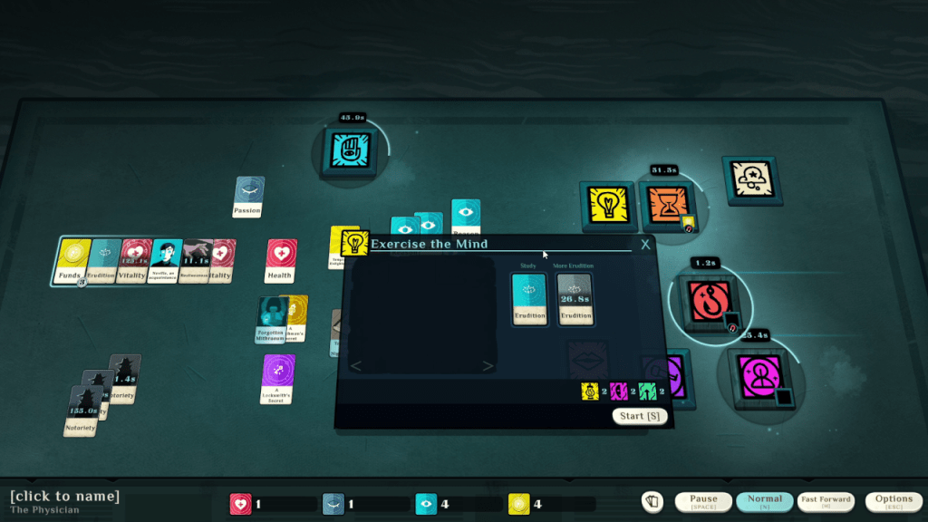 Cultist Simulator is probably one of the most obtuse games I have ever played. There is no tutorial and the game just throws you into the fray without giving you a single helping hand. I have yet to master even the most basic elements of this game but from what I’ve experienced, the basic game play loop breaks down into a timer management sim.