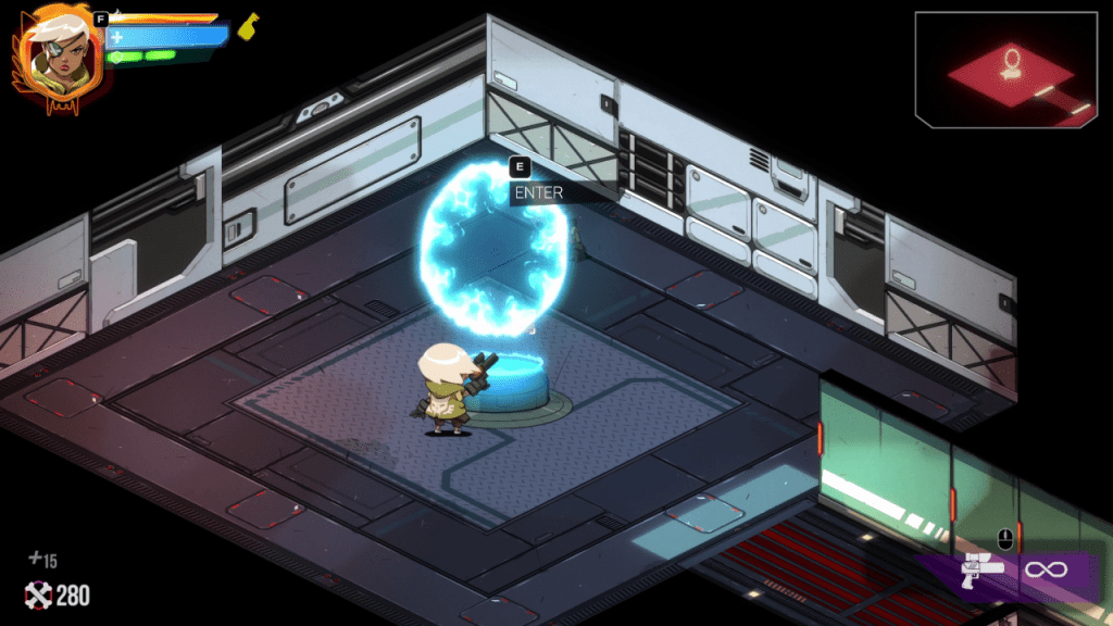 After exploring the dungeon, Wildcat Gun Machine does handy portals in convenient locations to teleport you back to the starting point of the map. There, you can purchase additional upgrades and lives. The upgrades can include things such as better pistols, increased movement speed, and improving your dash and grenade abilities.