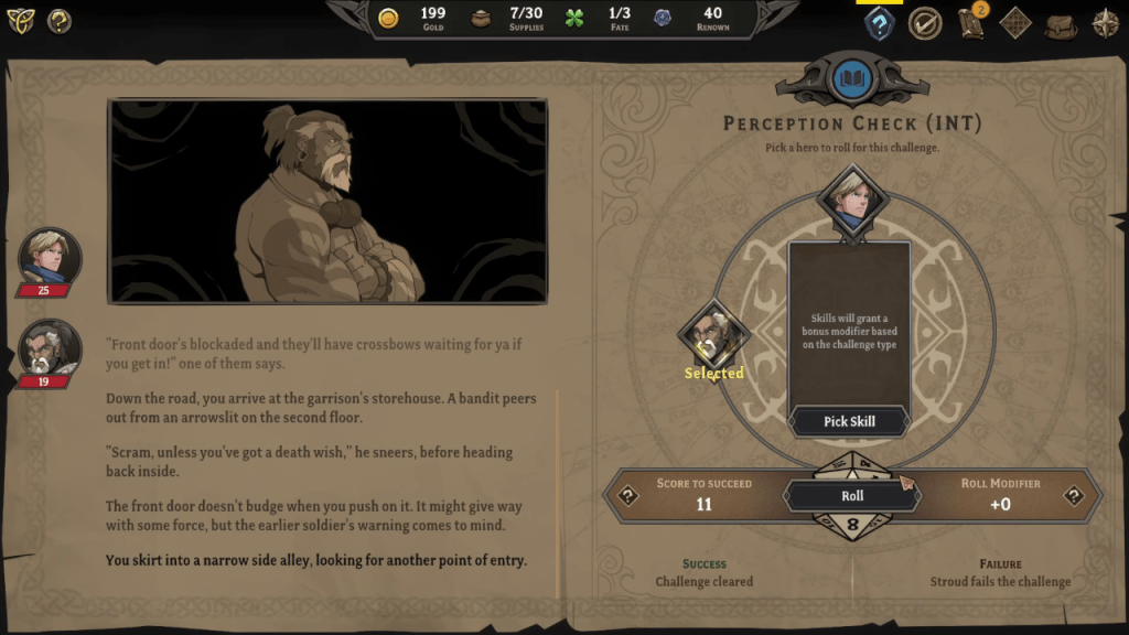 Quests usually have small scenarios play out. For example, one of the earlier quests have you break into a bandit hideout. You have the option of barging through the front door or enter via the roof. Each option has a chance of success or failure measured by rolling one dice, modified by your stat values. For breaking through the font door, having higher strength will make the dice roll easier while having higher intelligence will make it easier to observe and find another route to the rooftops.