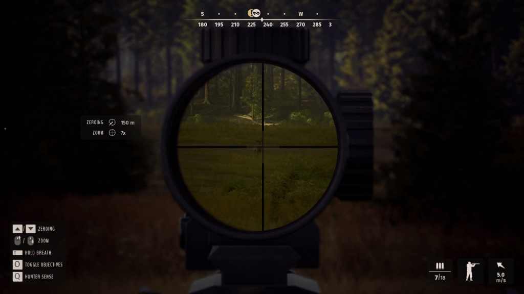 The animals in Way of the Hunter also seem to be spooked more easily so you have to approach them more carefully. You have an ability called Hunter Sense that allows you to spot the general location and status of animals at around two hundred and fifty meters when standing still. This is not really that big of an advantage as animals seem to be able to notice your presence at around three hundred and fifty meters or so.