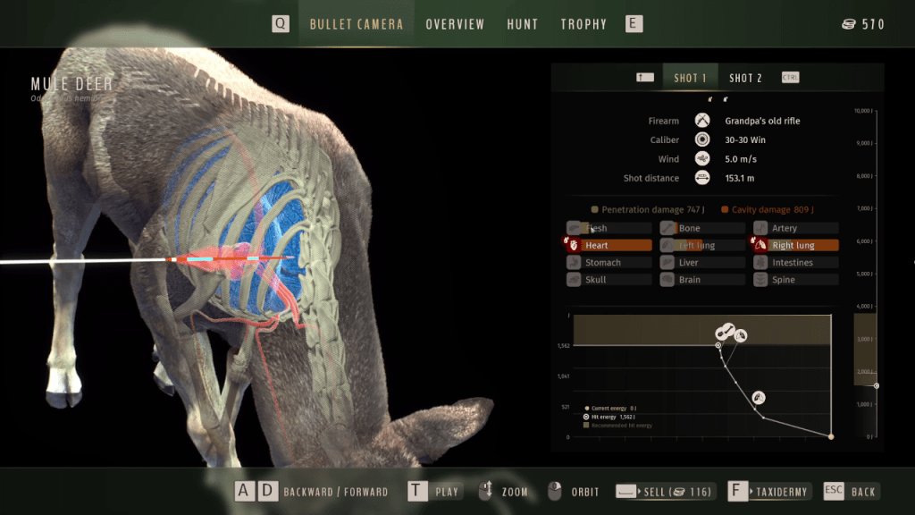The game also has a nice ballistics report on each animal shot. It will show the bullet trail and the damage to the specific organs and tissues.