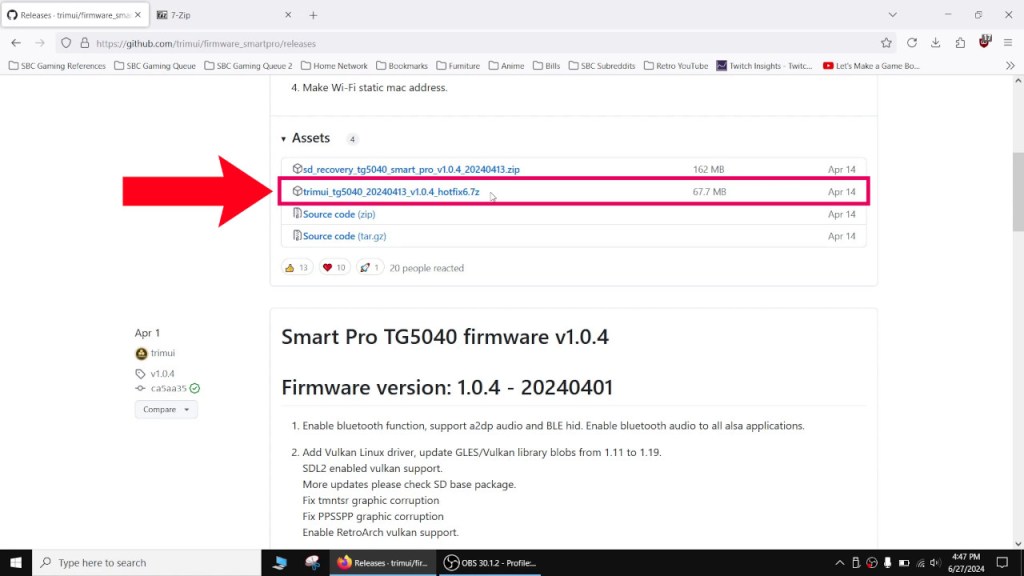 The latest file as of this recording was trimui_tg5040_20240413_v1.0.4_hotfix6.7z.